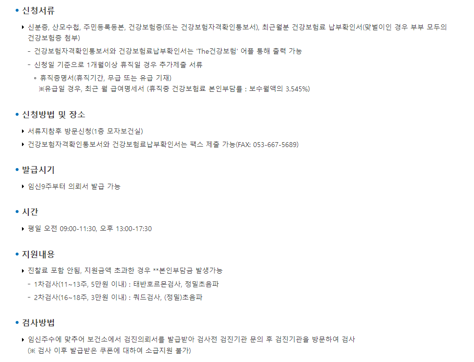 보건소 첫 방문 시 시간이 되어 바로 산전검사를 받았고 여성아이병원 초진 시 보건소에서 산전검사한 자료가 있다고 말씀드렸더니 추가적인 부분만 검사 진행하여 진료비를 절감할 수 있었어요.