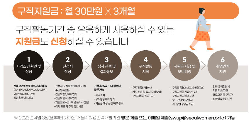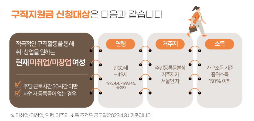 서울시는 「서울특별시 여성의 경제활동 촉진과 경력단절 예방에 관한 조례 」에 따라 적극적인 취·창업의지가 있는 3040 여성들의 '경제활동 참여촉진 및 지속가능 한 일 생활지원'을 위해 「2023년 서울우먼업 구직지원금」 지원대상을 모집하고 있습니다. 자세한 내용 알아보겠습니다.