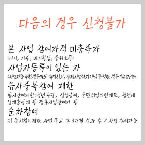 실업급여 및 생계급여, 국민취업지원제도, 정부재정지원 직접일자리, 청년수당 등 유사·중복사업 참여 종료 후 3개월 경과 시 참여가능