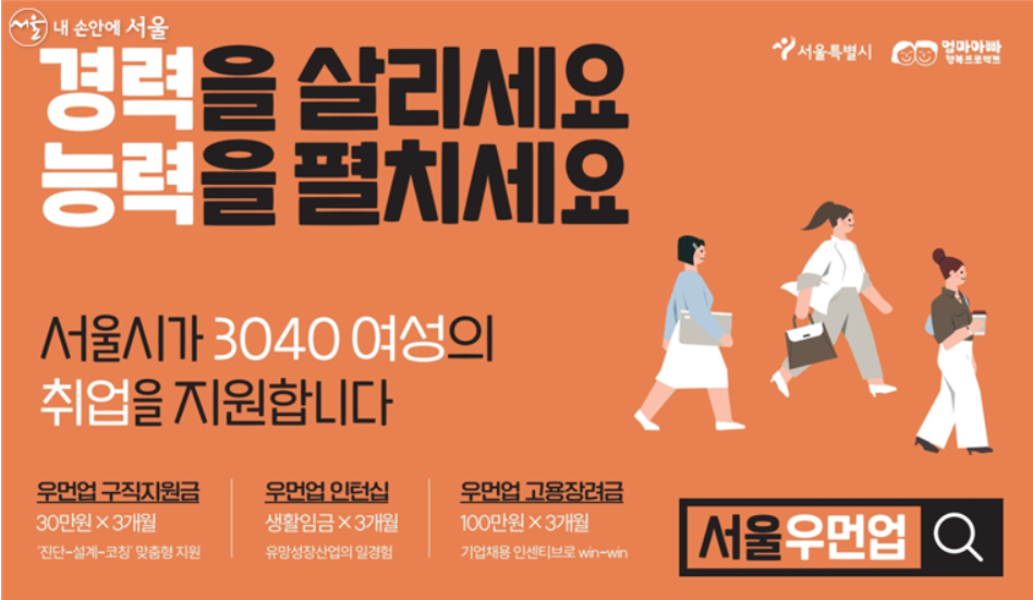 서울우먼업 구직지원금 사업은 경력보유 여성의 사회복귀를 돕기 위한 오세훈 시장의 공약으로 '엄마아빠 행복 프로젝트'의 일환으로 추진된 것입니다. 서울시가 3040 경력보유여성 2500명의 재취업을 돕기 위함으로 만 30-49세 미취업 미창업 여성을 대상으로 3개월간 월 30만 원씩 최대 90만 원의 구직 활동비를 지원합니다.