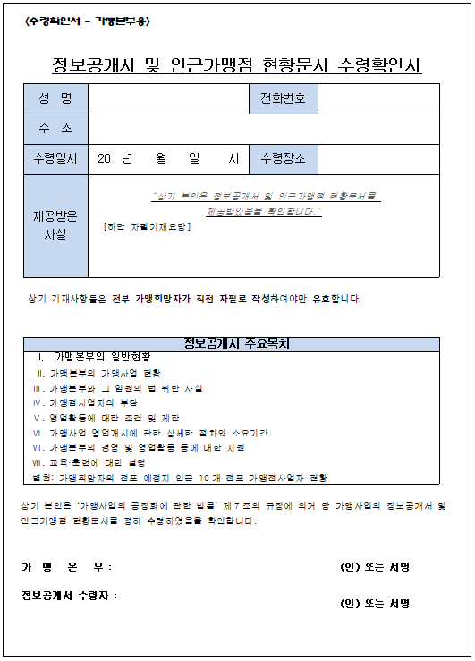- 정보공개서 및 인근가맹점 현황문서 수령확인서에 실제로 제공받은 일시와 장소를 자필로 정확히 작성하여야 합니다. 실제 제공일시보다 이전 일시로 작성하게 되면 추후 분쟁이 발생하였을 경우 가맹사업법에 따른 보호를 받지 못할 수도 있습니다.